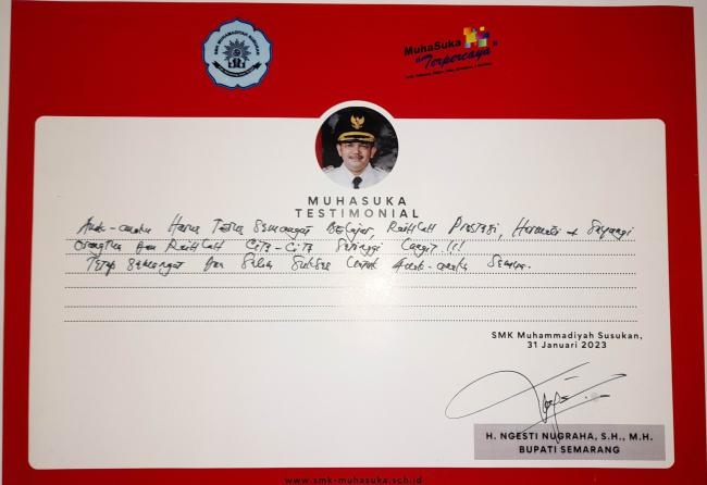 Hari Selasa tanggal 31 Januari 2023 Bupati Kabupaten Semarang hadir di SMK Muhasuka untuk memberikan motivasi belajar kepada siswa siswi... selengkapnya..